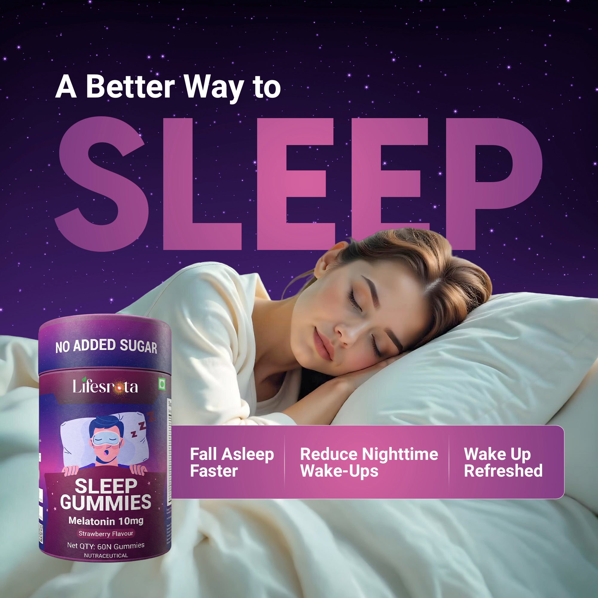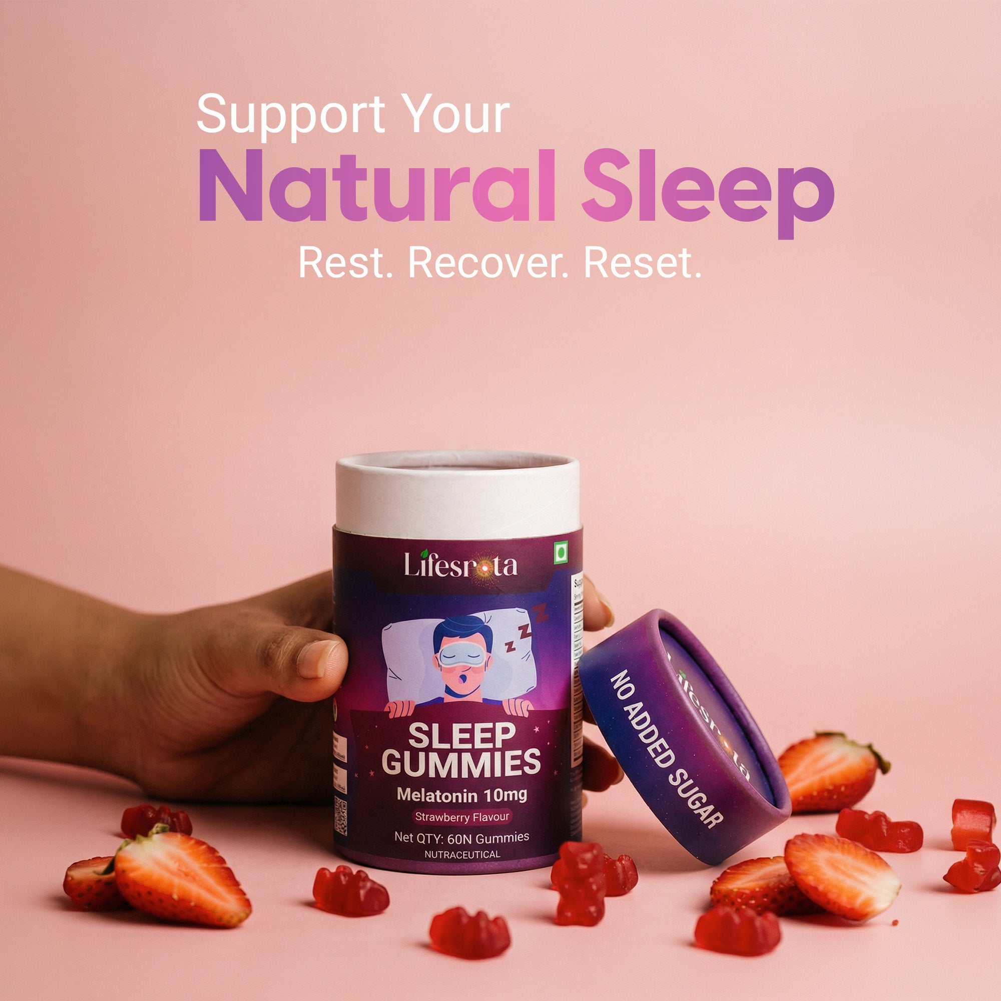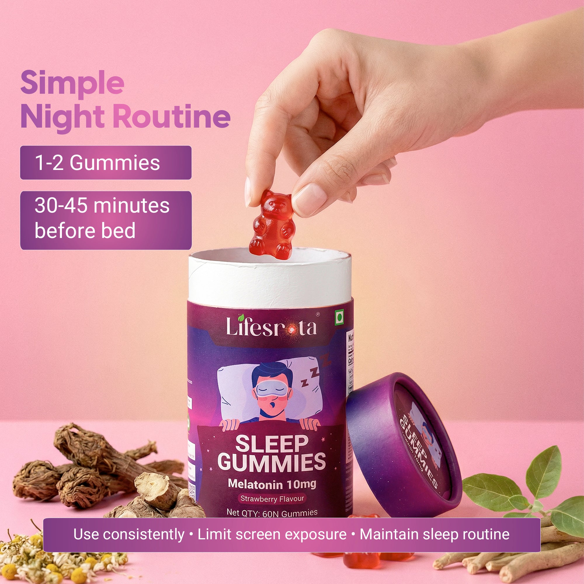 Sleep Gummies are an effective sleep support formulated to help you fall asleep naturally, stay asleep longer, and wake up feeling refreshed. Crafted with a synergistic blend of Melatonin, calming Ayurvedic herbs, and essential minerals, these gummies support the body’s natural sleep cycle without causing dependency. It is designed for modern lifestyles affected by stress, screen exposure, irregular routines, and mental overactivity. Sleep Gummies help calm the mind, relax the nervous system, and promote a healthy sleep cycle. The balanced formulation supports faster sleep onset, reduces nighttime restlessness, and improves overall sleep quality, so you wake up energized, clear-headed, and ready for the day.